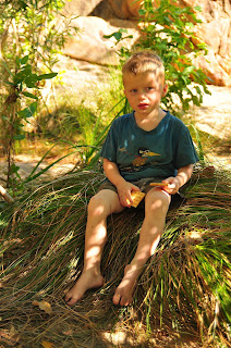 Réveil à 7h ce samedi matin, la chaleur étant importante on veut essayer de partir marcher tôt. Pfff ce n'est pas gagné, tout le monde traîne la patte. On arrive à la ballade vers 9h30. On est chargé car en plus de l'eau on a le pique-nique et le gros objectif. On commence la première boucle avec une famille française de Nouvelle-Calédonie, ils ont une fille de 5 ans et un petit de 18 mois. Les enfants sont motivés à marcher... ah l'effet de groupe! La promenade est chouette entre les roches de sable aux formes étranges et les anciennes grottes des aborigènes. On bifurque sur la Sandstone and River bushwalk pour longuer un peu la rivière et espérer observer les crocodiles. On s'approche du bord de l'eau... sur un talus rassurez-vous. On peut voir 2-3 spécimens nager à contre courant. Les français retournent car ils n'ont pas suffisamment d'eau, on continue un bout. Les petits traînent la patte, ils ont plus envie de jouer avec le sable du chemin que d'avancer avec cette chaleur. Heureusement les 3/4 de la balade sont à l'ombre. Mik va voir encore 2-3 spots entre les arbres... pas de croco... ils doivent se cacher sous l'eau pour le frais. On rebrousse chemin jusqu'à une grotte pour manger au "frais".
